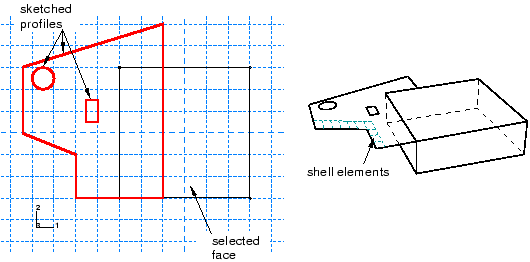 When you sketch on a planar face (for example, the side of a cube), the shell feature is created only where it extends beyond the face; a shell feature cannot overlap a face. A sketch on a planar face of a cube and the resulting shell feature are shown in Figure 7. In this example the shell feature is a fin extending beyond the selected face of the cube. Select from the main menu bar to create this type of feature.