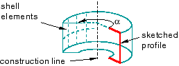 To create a revolved shell feature, you sketch a profile and revolve it through a specified angle (α). A construction line serves as the axis of revolution, as shown in Figure 4.