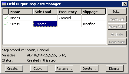 The Field Output Requests Manager and the History Output Requests Manager contain lists of all of the output requests that you have created. For example, the Field Output Requests Manager is shown in Figure 1. Figure 1. The Field Output Requests Manager.