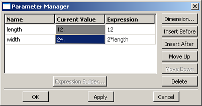 Parameters must be defined within a single sketch—you cannot define parameters in one sketch and use them to create expressions in another sketch. Defining a parameter adds it to the Parameter Manager for the sketch. The order of parameters in the manager indicates the order in which they can be used in expressions. Figure 1 shows two parameters; the length parameter is used to define the width parameter. If you instead wanted to define the length in terms of the width, the width parameter would need to appear first in the manager. You can use the buttons on the right side of the dialog box to create parameters by selecting dimensions from the viewport or to insert, move, or delete parameters from the manager. For detailed instructions, see Adding and editing parameters.