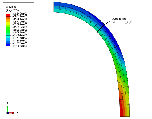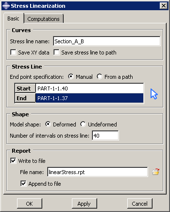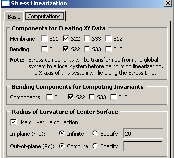 ![]() The stress line Section_A_B is defined through the vessel wall. Figure 2 and Figure 3 show the basic settings and computations, respectively, that you use to linearize the S22 stress component for the undeformed model shape. Figure 2. Stress linearization basic specifications.