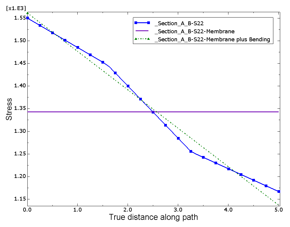 ![]() When you click Stress Linearization dialog box, Abaqus/CAE creates an X–Y plot of the S22 stress component (oriented normal to the stress line) and of the resulting linearized stresses, as shown in Figure 4. or in theFigure 4. Linearized stress plot.