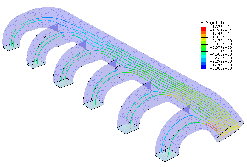 ![]() You can create streams by first defining a rake, which is a line segment with a series of points specified along its length that control the locations where Abaqus/CAE displays streamlines for a fluid flow analysis. Rakes are placed into an area of interest in the fluid flow; when you create and display the stream in the viewport, Abaqus/CAE displays a number of streamlines that corresponds to the number of points on the rake. Streamlines are evenly spaced along the rake, except for rakes defined using nontrivial path definitions; for more information about stream rake definition, see Creating a stream. The streamline shape is driven by the currently selected stream variable, which is usually velocity or vorticity. To change the current stream variable, see Selecting the stream field output variable. The streamline color is driven by the currently selected primary variable. For more information on customizing streamline color options, see Customizing stream colors. You must define separate stream rakes for each part instance for which you want to display flow data. Abaqus/CAE computes stream data for individual part instances only and does not display streamlines across separate part instances. |