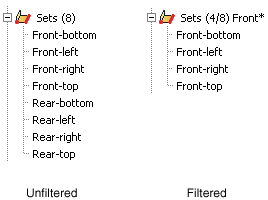 Items that are hidden by a filter cannot be manipulated from the Model Tree or Results Tree; however, these items are not removed from the model or output database. When a filter is in effect, the numbers in parentheses next to the container name indicate the number of visible items in the container followed by the total number of items (visible and hidden) in the container (see Figure 2). The filter string appears to the right of these numbers. To remove a filter, select Filter for the appropriate container, delete the filter string, and press Enter.