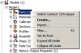 The Create menu item appears in bold font in Figure 1 because it is the default action. Double-clicking an item or selecting an item and pressing Enter invokes the default action. In most cases if an item is a container, the default action is to create a new item in the container. Similarly, if an item is not a container, the default action is to edit the item. For example, if you double-click the Parts container, Abaqus/CAE displays the Create Part dialog box and allows you to create a new part; if you double-click one of the parts within the container, Abaqus/CAE displays the Edit Part dialog box and allows you to edit the part you selected.