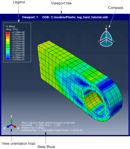 ![]() The viewport title and the border around the viewport are called the viewport decorations. The legend, state block, title block, view orientation triad, and 3D compass are called the viewport annotations. The view orientation triad and 3D compass indicate the orientation of the model currently being displayed. You can change the view of the model by clicking and dragging on the 3D compass; the three perpendicular axes on the view orientation triad rotate with the compass to indicate the current view orientation. For more information, see The 3D compass, and Customizing the view triad. The legend, state block, and title block identify results you display using the Visualization module. For more information, see Customizing viewport annotations.” |