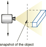 Panning the view is comparable to moving the camera over a snapshot of the model, as shown in Figure 1; the snapshot moves in the viewport but any faces of the model that were hidden in the original camera position remain hidden as you pan. Figure 1. Panning the view.