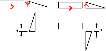 Abaqus/CAE positions the movable instance so that the two edges are parallel and the arrows point in the same direction. In addition, the movable instance is translated to satisfy the clearance specified. The orientation of the fixed instance remains unchanged. The effect of specifying the distance and changing the direction of the arrow is illustrated with two-dimensional instances in the following figure: