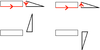 Abaqus/CAE positions the movable instance so that the two edges are parallel and the arrows point in the same direction. The orientation of the fixed instance remains unchanged. The effect of changing the direction of the arrow is illustrated in the following figure: