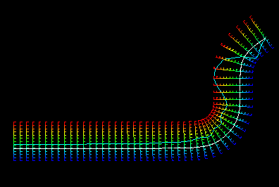 ![]() The normal lines, or tick mark axes, are drawn at nodes. At part boundaries, two tick mark axes are drawn. Within a part, if the angle between two adjacent line elements is less than the specified feature angle, a single tick mark axis is drawn in the direction of the average normal of elements sharing the node. Otherwise, a tick mark axis is drawn normal to each element sharing the node. When averaging normals, only displayed elements of the same type are considered in the calculation. |