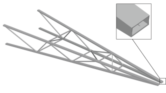 Context: When beam profiles are displayed, Abaqus/CAE disables both view cuts and scaling and shrinking of the model. Displaying beam profiles is useful for checking that the correct profile has been assigned to a particular region and that the assigned beam orientation results in the expected orientation of the profile. For example, Figure 1 shows the box beam profiles displayed on the light-service crane described in Will link to gsa-bms-exacargocrane. Figure 1. The cargo crane example with beam profiles displayed.