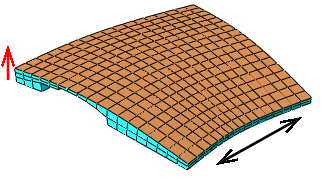 Context: The stack orientation tool allows you to assign a stack orientation to all cells or to selected cells within a solid part or part instance, as long as the cells do not have tetrahedral elements assigned. You can use the tool to apply a stack orientation quickly to a group of cells in a single operation. You assign the stack orientation based on a selected face; the stack is oriented such that the selected face is the top of the stack. Abaqus/CAE applies the orientation regardless of the mesh technique used for the cells; so the sweep direction, if one exists, does not matter. The stack orientation tool was used to assign an orientation through the thickness of the part in Figure 1, as shown by the red arrow; the top faces of the elements are colored brown. The complex profile of the swept solid part did not allow the desired stack orientation using the sweep path—the two available sweep directions are indicated by the black arrow in the figure. Figure 1. The stack orientation need not follow the sweep direction.
