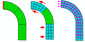 ![]() Application of a new stack orientation may vary depending on the cells selected. Figure 2 illustrates a case where the stack direction changes as more cells are meshed. The upper left face was used for the reference orientation, so the mesh orientations for the two disconnected cells in the center image match this orientation. However, when the center cell is meshed, the orientation of the elements in the lower right cell is updated to align with the other two cells, as shown in the image on the right. Figure 2. Stack orientation may change if you add cells to a mesh.
