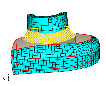 Toggle on Connecting sides, and click Select. Rotate the part as needed to select the three faces that represent the fillet between the top protrusion and the body of the part and the corresponding flat face on the front of the part, colored yellow in Figure 2.
