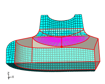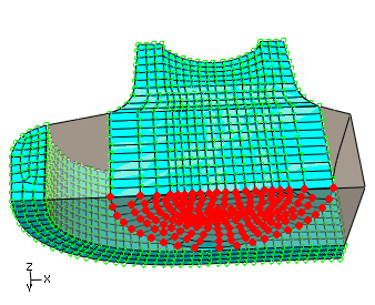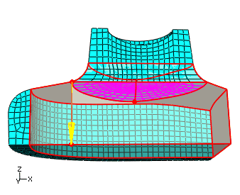 Creating a bottom-up extruded mesh:Extending the extruded mesh:Context: The extruded bottom-up mesh ends near the bottom face of the region, as dictated by the nonplanar source side and the length of the extrusion vector. You can edit the nodes in the last extruded element layer so that they end exactly on the bottom face of the region. |
