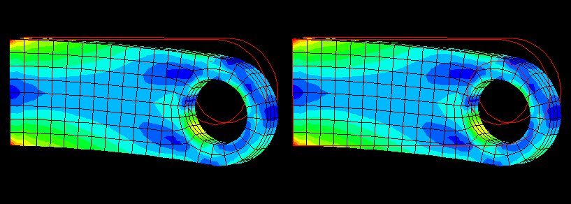 Context: You can rearrange the order in which the layers are plotted, and you can apply a small offset to all the layers in the screen Z-direction (perpendicular to the plane of the screen) to separate them in the display and eliminate any undesirable visual effects. If you apply a positive offset, the layers are drawn in the viewport in the order shown in the Overlay Plot Layer Manager (the last layer in the manager is the topmost layer in the viewport). If you apply a negative offset, the drawing order is reversed. Figure 1 shows an example of an overlay plot with different offset values applied. Figure 1. Overlay of undeformed and contour plots: positive offset on left, negative offset on right.