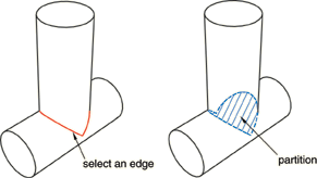 Use the Select Edges method to partition a cell by defining an N-sided patch from a sequence of selected edges. Use the text field in the prompt area to select the method of choosing edges: