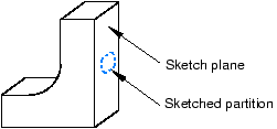 If the faces to be partitioned are planar and lie in the same plane, you can sketch directly on that plane. Your sketch can extend beyond the boundaries of the selected faces, but the partition will not extend beyond the edge of the faces. The following figure illustrates a sketched partition on a planar face:
