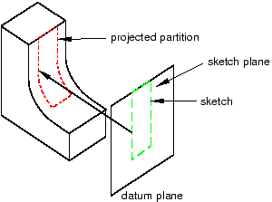If any of the faces to be partitioned are nonplanar or do not lie in the same plane, you must select a planar face or datum plane on which to sketch. Abaqus/CAE creates the partition by projecting the sketch onto the faces to be partitioned. You can specify the direction of the projection and the distance of the projection, normal to the sketch plane. The following figure illustrates a sketched partition on a nonplanar face using the projection of a sketch drawn on a datum plane: