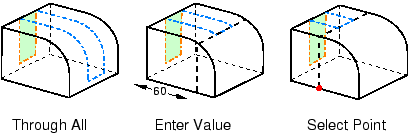 From the buttons in the prompt area, select a method to determine how far Abaqus/CAE projects the sketch normal to the sketch plane. The partition is created wherever the projected sketch extends through the selected faces. The three methods are illustrated in the following figure: