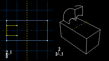 You add a revolved shell feature by sketching a profile and a construction line on a selected face. The construction line serves as an axis of revolution, and Abaqus/CAE creates the shell feature by rotating the profile about the axis using a specified angle of revolution. A sketch and the resulting feature, rotated about the axis of revolution through an angle of 90°, are illustrated in the following figure: