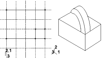 You add a revolved solid feature by sketching a two-dimensional cross-section and a construction line on a selected face. The construction line serves as an axis of revolution, and Abaqus/CAE creates the solid feature by rotating the cross-section about the axis using a specified angle of revolution. In addition, you can specify a pitch and a direction along the axis of revolution that Abaqus/CAE uses to translate the sketch along the axis of revolution as it revolves the profile. A sketch and the resulting feature, revolved through an angle of 180° with pitch, are illustrated in the following figure: