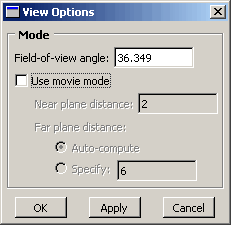 If the movie mode camera is positioned inside the model, the camera moves back along the current view direction so that the entire model is in front of the camera. Abaqus/CAE adjusts the field-of-view angle to display the model in a size similar to that in the movie mode view and resets the near plane and far plane distances to include the entire object in the view the next time you activate movie mode.