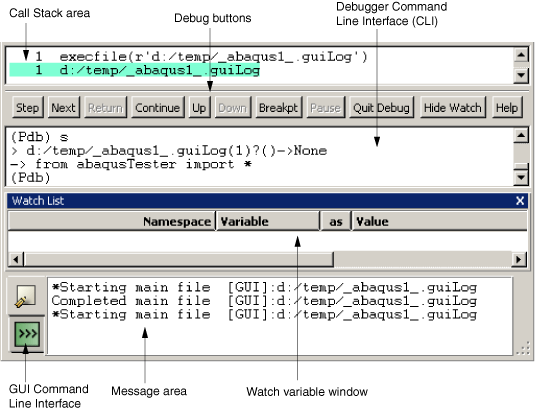 The debugger consists of a call stack area, action buttons, and the debugger command line interface (CLI) window, as shown in Figure 1. The debugger is positioned between the Abaqus PDE main window and the message area. Figure 1. The
