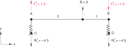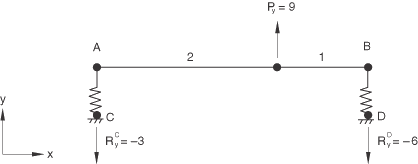 For example, to impose the equation you would first write the equation in the standard form, There are three terms in this equation (N=3). P=5, i=3, =1.0, Q=6, j=1, =−1.0, R=1000, k=3, and =1.0. Input File Usage EQUATION N P, i, , Q, j, , etc. For example, the following input could be used to define the equation constraint above: EQUATION 3 5, 3, 1.0, 6, 1, -1.0, 1000, 3, 1.0 Either node sets or individual nodes can be specified as input. If node sets are used, corresponding set entries will be matched to each other. If sorted node sets are given as input, you must ensure that the nodes are numbered such that they will match up with each other correctly once sorted. The nodes in an unsorted node set will be used in the order that they are given in defining the set (see Node definition). If the first entry is a single node, subsequent entries must be single nodes. If the first entry is a node set, subsequent entries can be either node sets or single nodes. The latter option is useful if a degree of freedom at each of a set of nodes depends on a degree of freedom of a single node, such as may occur in certain symmetry conditions or in the simulation of a rigid body. Abaqus/CAE Usage Interaction module: Create Constraint: Equation The nodes must be specified as sets. The first set can contain one or more points. Subsequent sets must contain only a single point. In Abaqus/Standard the first nodal variable specified ( corresponding to ) will be eliminated to impose the constraint (in the above equation constraint, degree of freedom 3 at node 5 will be eliminated); therefore, it should not be used to apply boundary conditions, nor should it be used in any subsequent multi-point constraint, kinematic coupling constraint, tie constraint, or equation constraint (see About Kinematic Constraints). In addition, the coefficient should not be set to zero. These restrictions do not apply in Abaqus/Explicit. In Abaqus/Standard a linear multi-point constraint cannot be used to connect two rigid bodies at nodes other than the reference nodes, since multi-point constraints use degree-of-freedom elimination and the other nodes on a rigid body do not have independent degrees of freedom. In Abaqus/Explicit a rigid body reference node or any other node on a rigid body can be used in an equation constraint definition. Use with transformed coordinate systemsIf a local coordinate system (Transformed coordinate systems) is defined for any node involved in the equation, the variables at that node appear in the equation in the local system. Use within a partIf an equation constraint is defined at the part (or part instance) level, the nodal variables are transformed initially according to the positioning data given for each instance of the part (see Assembly definition). Note: Equation constraints cannot be defined at the part (or part instance) level in Abaqus/CAE. Prescribing a nonhomogeneous constraintIt is sometimes necessary to impose a constraint in the form where is a prescribed value that may vary with time, t. This is easily done by rewriting the equation as and introducing a node, Z, that is not attached to any element in the model. Choosing to be some convenient degree of freedom m at node Z allows the prescribed value to be imposed through a boundary condition specification. If necessary, an amplitude reference can be provided to give the variation with time (see Boundary conditions in Abaqus/Standard and Abaqus/Explicit); such an amplitude reference is required in Abaqus/Explicit for prescribed displacements. For example, assume that node 1000 in the example above is a “dummy” node that appears only in this equation and is not attached to any other part of the model. Defining a boundary condition to constrain degree of freedom 3 at node 1000 to −12.5 would impose the constraint Constraint forces and global equilibriumLinear constraint equations introduce constraint forces at all degrees of freedom appearing in the equations. These forces are considered external, but they are not included in reaction force output. Therefore, the totals provided at the end of the reaction force output tables may reflect an incomplete measure of global equilibrium. To illustrate this behavior, consider a spring-supported beam subjected to a concentrated load as shown in Figure 1. The static reaction forces are and . In Figure 2 the same structure is subjected to the additional linear constraint equation , which constrains the beam to remain horizontal. This introduces constraint forces and , and the new reaction forces are . These reaction forces produce a global force balance in the Y-direction, but since the constraint forces are not included in reaction force output, the global moment balance about point A cannot be verified. Figure 1. Beam with no linear constraints.
