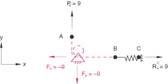 ![]() The global force balance can also be incomplete. This is demonstrated in Figure 3, where a pulley connection between nodes A and B is represented by the linear constraint equation . The constraint forces at the pulley, and , are not included in the reaction force output, producing incomplete global force balances in both the X- and Y-directions. Figure 3. Pulley connection represented by the linear constraint