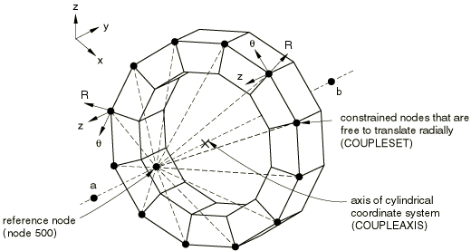 Internal nodes are created by the kinematic coupling to enforce the constraints that are equivalent to MPC types REVOLUTE and UNIVERSAL. These nodes have the same degrees of freedom as the additional nodes used in these MPC types and are included in the residual check for nonlinear analysis. Specifying a local coordinate systemThe constrained degrees of freedom at the coupling nodes can be specified in a local coordinate system instead of the (default) global coordinate system (see Orientations). Figure 1 illustrates the use of a local coordinate system definition with a kinematic coupling constraint to constrain all but the radial translation of a group of nodes to a reference node. In this example a local cylindrical coordinate system is defined that has its axis coincident with the structure's axis. The coupling node constraints are then specified in this local coordinate system. In this example the constrained nodes are attached to continuum elements; thus, only translational degrees of freedom need to be specified. Input File Usage KINEMATIC COUPLING, REF NODE=node, ORIENTATION=name For example, the following input is used to specify the kinematic coupling constraint shown in Figure 1: ORIENTATION, SYSTEM=CYLINDRICAL, NAME=COUPLEAXIS 0.0, -1.0, 0.0, 0.0, 1.0, 0.0 KINEMATIC COUPLING, REF NODE=500, ORIENTATION=COUPLEAXIS COUPLESET, 2, 3 Constraint directions and finite rotationsIn geometrically nonlinear analysis steps, the coordinate system in which the constrained degrees of freedom are specified will rotate with the reference node regardless of whether the constrained degrees of freedom are specified in the global coordinate system or in a local system. Thus, the constraint shown in Figure 1 will enable free radial motion throughout arbitrary rotations of the structure. Radial motion in this case is defined as motion normal to the structure's axis (defined in the undeformed configuration by points a and b in the figure), with this axis rotating with the reference node. Therefore, the free radial expansion shown in Figure 1 will not refer to an axis parallel to the global y-axis for general rotations of the reference node but will refer to an axis that rotates with the structure. Rotation of the constraint directions is not affected by the selection of the constrained degrees of freedom. |