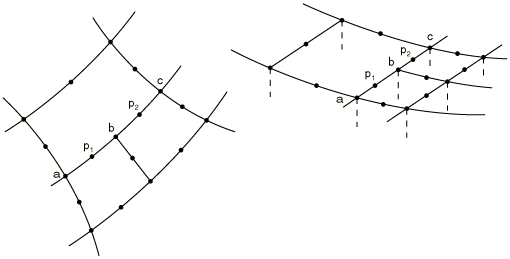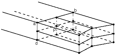 ![]() Input dataGive the nodes p, a, and b as shown in Figure 5. Input File Usage Use the following option to define a P LINEARMPC: MPC P LINEAR, p, a, b Use the following option to define a T LINEARMPC: MPC T LINEAR, p, a, b Abaqus/CAE Usage Mesh refinement multi-point constraints are not supported in Abaqus/CAE. Using MPC types P BILINEAR and T BILINEARThe P BILINEARMPC can be used in conjunction with the C BIQUADMPC for mesh refinement of pore fluid flow-displacement elements in three dimensions. The T BILINEARMPC can be used in conjunction with the C BIQUADMPC for mesh refinement of fully coupled temperature-displacement and fully coupled thermal-electrical-structural elements in three dimensions. These MPC types are available only in Abaqus/Standard. These MPCs constrain the pore pressure (P LINEAR) or temperature (T LINEAR) at node p to be interpolated bilinearly from the pore pressure or temperature at nodes a, b, c, and d (Figure 6). Figure 6. P BILINEAR and T BILINEARMPCs.