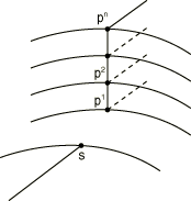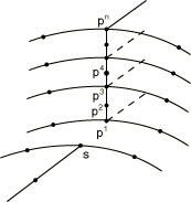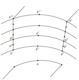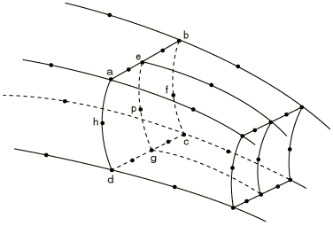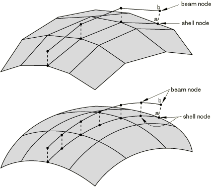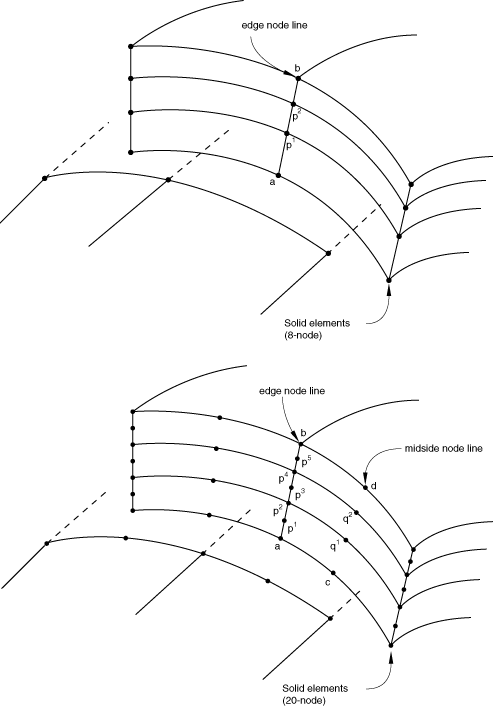 Modeling a shell-to-solid element transitionThe SLIDER, SS LINEAR, SS BILINEAR, and SSF BILINEARMPCs allow for a transition from shell element modeling to solid element modeling on a shell surface. This modeling technique can be used to obtain solutions at shell-solid intersections or other discontinuities, where the local modeling should use full three-dimensional theory but the other parts of the structure can be modeled as shells. The shell-to-solid submodeling capability (About submodeling) and the surface-based shell-to-solid coupling constraint (Shell-to-solid coupling) can also be used to obtain more accurate solutions in such cases, with considerably less modeling effort. In Abaqus/Standard the MPC usage assumes that the interface between the shell and solid elements is a surface containing the normals to the shell along the line of intersection of the meshes, so that the lines of nodes on the solid mesh side of the interface in the normal direction to the surface are straight lines. (Line a, , , …, b in Figure 14 and lines , , …, in Figure 19 to Figure 20 should be straight lines.) It also assumes that the nodes of the solid elements are spaced uniformly on the interface surface as indicated in Figure 14 and Figure 19 to Figure 20. For each shell node on the edge use MPC type SS LINEAR, SS BILINEAR, or SSF BILINEAR, as appropriate, to constrain the shell node to the corresponding line or face of solid element nodes through the thickness. Then, use a SLIDERMPC to constrain each interior node on the line through the thickness to remain on the straight line defined by the bottom and top nodes of that line. For an example, see Multi-point constraints. The SS BILINEAR and SSF BILINEARMPCs are not intended for use with the variable node solid elements (C3D27, C3D27H, C3D27R, and C3D27RH). In Abaqus/StandardMPCs SS LINEAR, SS BILINEAR, and SSF BILINEAR eliminate all displacement components and two of the rotation components at the shell node, and the SLIDERMPC eliminates two displacement components at each interior solid element node in the interface. Therefore, any boundary conditions needed at the interface (such as those required when the shell/solid interface intersects a symmetry plane) should be applied only to the top and bottom nodes on the solid element side of the interface. Using MPC type SS LINEARMPC type SS LINEAR constrains a shell corner node to a line of edge nodes on solid elements for linear elements (S4, S4R, or S4R5; C3D8, C3D8R; SAX1; CAX4; etc.). The constrained nodes need not lie exactly on these lines, but it is suggested that they be in close proximity to the lines for meaningful results. Figure 19. SS LINEAR type MPC. 4-node shells to 8-node