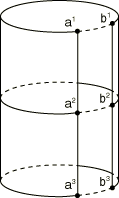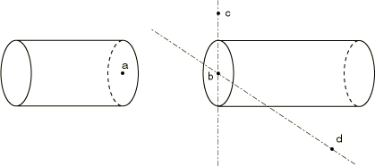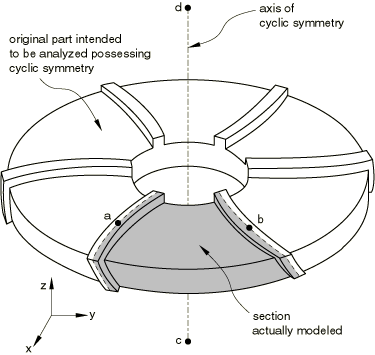 ![]() Using MPC type CYCLSYMMPC type CYCLSYM is used to enforce proper constraints on the radial faces bounding a segment of a cyclic symmetric structure (see Figure 9). This MPC type is available only in Abaqus/Standard. MPC type CYCLSYM imposes the cyclic symmetry by equating radial, circumferential, and axial displacement components (and rotations, if active) at the two nodes (a and b). The symmetry axis can be defined by the original coordinates of two additional nodes (c and d) that do not need to be connected to any element in the structure. Scalar degrees of freedom (such as temperature) are made equal. Figure 9. MPC type CYCLSYM.