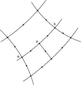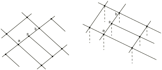 Using mesh refinement MPCs with shell or beam elementsThe Abaqus/Standard shell elements S4R5, S8R5, S9R5, and STRI65 use a penalty method to enforce transverse shear constraints on the edges of the element. The use of mesh refinement MPCs LINEAR and QUADRATIC may, therefore, lead to overconstraining or “shear locking” of the bending behavior. Graded meshes, using the triangular elements as necessary to create a transition zone, are recommended for mesh refinement with these elements. The shear flexible beam elements in Abaqus/Standard such as B31 or B32 will also “lock” if used as stiffeners along a mesh line where the mesh refinement MPCs are used. For shell elements in Abaqus/Explicit the rotational degrees of freedom are not constrained by the LINEARMPC; therefore, a hinge is formed along the line defined by the constrained nodes. Using MPC type LINEARMPC type LINEAR is a standard method for mesh refinement of first-order elements. However, in Abaqus/Explicit it might be preferable to use a surface-based tie constraint (see Mesh tie constraints) for mesh refinement, particularly when one or more of the meshes to be constrained involve shell elements with thickness. This MPC constrains each degree of freedom at node p to be interpolated linearly from the corresponding degrees of freedom at nodes a and b (see Figure 1). Figure 1. LINEAR type MPC.