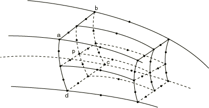 ![]() Using MPC type QUADRATICMPC type QUADRATIC is a standard method for mesh refinement of second-order elements. This MPC type is available only in Abaqus/Standard. This MPC constrains each degree of freedom at node p (where p is either or ) to be interpolated quadratically from the corresponding degrees of freedom at nodes a, b, and c (Figure 2). For coupled temperature-displacement, coupled thermal-electrical-structural, or pore pressure elements, only the displacement degrees of freedom are constrained. Figure 2. QUADRATIC type MPC.