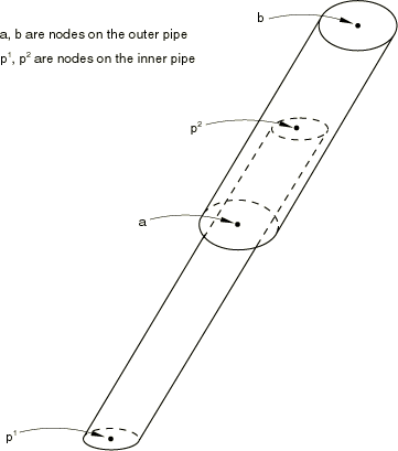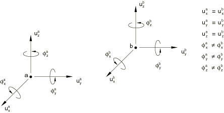 ![]() Input dataGive the nodes a and b as shown in Figure 11. Input File Usage MPC LINK, a, b Abaqus/CAE Usage Use one of the following options: Interaction module: Create Connector Section: select MPC as the Connection Category and Link as the MPC Type Interaction module: Create Constraint: MPC Constraint; select Link as the MPC Type Using MPC type PINMPC type PIN provides a pinned joint between two nodes. This MPC makes the global displacements equal but leaves the rotations, if they exist, independent of each other, as shown in Figure 12. Figure 12. MPC type PIN.