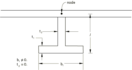 ![]() Input dataGive the nodes a and b as shown in Figure 7. Input File Usage MPC BEAM, a, b Abaqus/CAE Usage Use one of the following options: Interaction module: Create Connector Section: select MPC as the Connection Category and Beam as the MPC Type Interaction module: Create Constraint: MPC Constraint; select Beam as the MPC Type Constraining a beam stiffener to a shellThe general method of using a beam as a stiffener on a shell is to define the beam and shell elements with separate nodes. These nodes can then be constrained to each other using BEAM type MPCs. A more economical way, when applicable, is to use the same node for the beam node and the shell node and then define the offset of the center of the cross-section of the beam in the beam section data. Figure 8 shows a T-shaped stiffener attached to a shell, using the I-beam cross-section. This is done by setting l (see Beam cross-section library) equal to the distance between the node and the underside of the lower flange and setting the thickness of the top flange to zero. This approach can be used with all beam elements that use TRAPEZOID, I, or ARBITRARY beam sections. Figure 8. Stiffened shell.