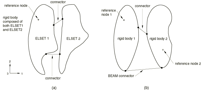 To illustrate, refer to Figure 6(b): as the symmetry boundary conditions specified at the dependent nodes are consistent with each other, they are removed from the dependent nodes and applied to the reference node (boundary condition in the 2-direction). In addition, the symmetry constraints preclude rotations about the 1- and 3-directions; therefore, zero rotational boundary conditions are applied to the reference node about these axes. Connector elements and rigid bodiesIn most cases detection and automatic resolution of redundant constraints involving connector elements cannot be done by simple inspection of the constraints involved. However, the examples shown in Figure 7 are simple enough to be resolved automatically. It is assumed that the connector elements are connected to nodes on the rigid body whose rotational degrees of freedom are dependent on the rotation of the reference node. In Figure 7(a) the connector elements are assumed to enforce some kinematic constraints. They are redundant since the rigid body definition constrains the motion of all nodes to the motion of the rigid body's reference node. Abaqus/Standard automatically removes the connector elements from the model. Figure 7. Redundant constraints involving rigid bodies and connector