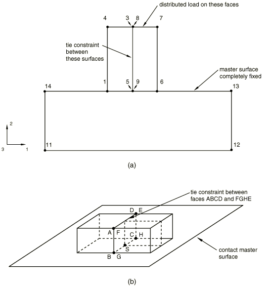 ![]() If the coupling constraint was defined as kinematic, it will not be enforced at nodes 1001–1003 to avoid overconstraining the model. The removed overconstraint may be inconsistent such as when incompatible boundary conditions are prescribed at the two reference nodes. However, the constraint will be enforced at nodes 1004 and 1005 since these nodes do not belong to the rigid body. If a distributing coupling constraint was used instead, the model would not be overconstrained. However, if node 101 was added to the rigid body definition and nodes 1004 and 1005 were not included in the coupling constraint, the model would be overconstrained. Indeed, all nodes involved in the coupling constraint would be already constrained by the rigid body definition, making the coupling constraint redundant. To avoid the overconstraint, Abaqus/Standard will not enforce the coupling constraint in this case. Coupling constraints and boundary conditionsWhen boundary conditions are specified at all nodes involved in a distributing coupling constraint, the model may become overconstrained. Abaqus/Standard will issue a warning message outlining the cause of the potential overconstraint. Spot welds and rigid bodiesPotential overconstraints that may arise when a rigid body is involved in a mesh-independent spot weld definition are discussed in Mesh-independent fasteners. Overconstraints detected and resolved during analysisThere are numerous situations when contact interactions in combination with other constraint types may lead to overconstraints. Since contact status typically changes during the analysis, it is not possible to detect redundant constraints associated with contact in the model preprocessor. Instead, these checks are performed during the analysis. Due to the complexities associated with contact interactions, only a limited number of redundant constraint cases are resolved automatically. Contact interactions and tie constraintsRedundant constraints are common in cases when slave nodes used in surface-based tie constraints (Mesh tie constraints) are also slave nodes in contact, as illustrated in Figure 9. In Figure 9(a) nodes 5 and 9 are connected with a tie constraint, and both are in contact with a master surface. Since the two nodes are tied together, one of the contact constraints is redundant. A similar situation is presented in Figure 9(b): two mismatched solid meshes are connected with a tie constraint, and contact is defined with a flat rigid surface. Node S is a dependent node in the tie constraint, so its motion is determined by that of nodes B and C. Therefore, any contact constraint applied at node S is redundant. Moreover, the contact constraints at nodes G and H are redundant, since the motion of these nodes is determined by nodes B and C, respectively. Figure 9. Redundant constraints arising from contact interactions and tie