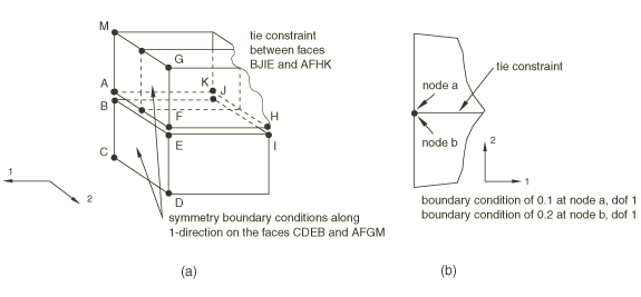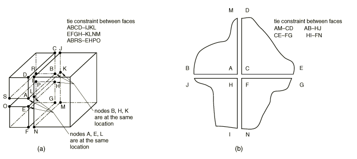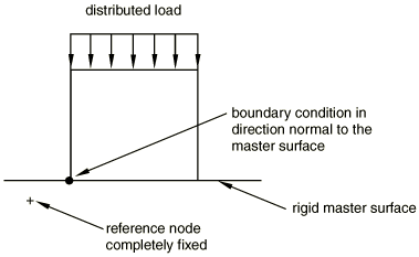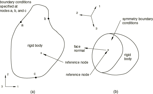 ![]() In case (a) if the specified boundary conditions are not consistent with the rigid constraint, the model will be inconsistently overconstrained. In case (b) if the reference node has the symmetry boundary conditions, there is no need to have symmetry boundary conditions at the nodes of the flat surface. Abaqus/Standard will attempt to remove all boundary conditions specified at the dependent nodes and redefine them at the reference node. To do so, the consistency of the boundary conditions specified at the dependent nodes is checked. If the boundary conditions are not identical, an error message is issued and the analysis is stopped (since otherwise the solution of a nonlinear system of equations would be required in the general case to assess whether the boundary conditions are consistent or not). Otherwise, Abaqus/Standard will try to merge the boundary conditions at the dependent nodes with those at the reference node by: