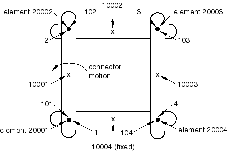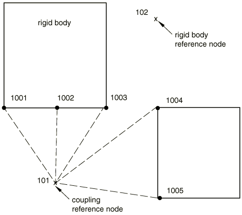 ![]() When connector elements are placed between two rigid bodies (as in Figure 7(b)), the model may be redundantly constrained. As shown in Figure 7(b), if a connector element of type BEAM (or WELD) is placed between two rigid bodies, the connection is rigid and any additional connector elements between the two rigid bodies are redundant. Abaqus/Standard will automatically remove these redundant connector elements. When the ensemble of connector elements placed between two rigid bodies enforces more than the necessary translational and rotational constraints between the two rigid bodies, but none of the connectors is of type BEAM (or WELD), only warning messages are issued to signal the overconstraint situation. In these cases none of the connector elements can be eliminated automatically since the connection between the two rigid bodies may become underconstrained. To illustrate this situation, assume that in Figure 7(b) the two connectors were of type SLOT and TRANSLATOR. Thus, four translational constraints (in three dimensions) are enforced between the two rigid bodies, rendering the system overconstrained since only three translational constraints are needed to fully constrain the relative translation between the two bodies. However, if the SLOT were eliminated from the model, the model would become underconstrained and different from the original one. Only a warning message is issued in this case. Coupling constraints and rigid bodiesWhen all or some of the nodes involved in a kinematic coupling constraint belong to the same rigid body, the coupling constraint becomes redundant. The situation is illustrated in Figure 8. Node 101 is the reference node for the coupling constraint involving nodes 1001–1005. At the same time nodes 1001–1003 are included in the rigid body definition with reference node 102. Figure 8. Redundant constraints involving coupling constraints and rigid