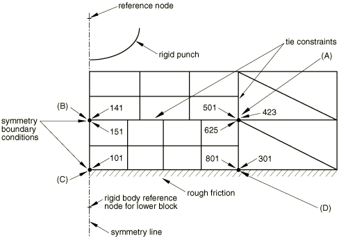 ![]() The upper block is built from three separately meshed regions, which are connected together using a surface-based tie constraint. This block is in contact with the lower rigid block, which is made rigid by specifying a rigid body constraint. The rigid block's reference node is fixed. Symmetry boundary conditions are used at the left edge of the upper block, and rough friction is defined for the surface interaction between the upper and lower blocks. The following redundant constraints can be identified: