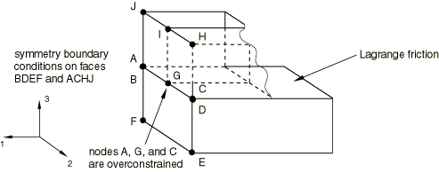 ![]() The contact and boundary conditions related to overconstraints are removed automatically only if the master surface is defined as an analytical rigid surface. In all other cases, if an overconstraint occurs during the analysis, a zero pivot message is issued by the equation solver (see below) and the chains of constraints responsible for the overconstraint are clearly outlined. Checks related to Lagrange frictionA common redundant constraint case is depicted in Figure 11. The symmetry boundary conditions combined with the Lagrange friction are redundant. Figure 11. Lagrange friction and boundary conditions.