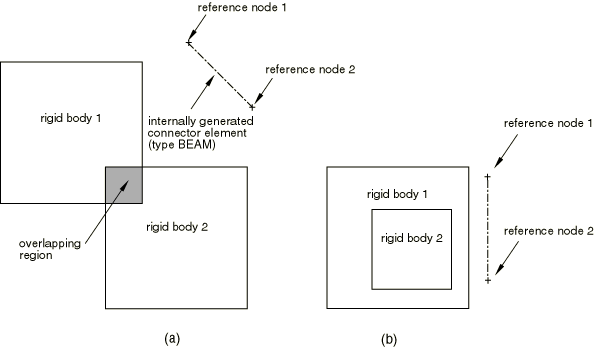 ![]() Tie constraint between two rigid bodiesAn example of a tie constraint between two rigid bodies is shown in Figure 3(b). If the two surfaces are connected by a tie constraint at more than two or three points (in two- or three-dimensional analyses, respectively), the tie constraint definition is redundant. A connector type BEAM is placed between the two reference nodes, and the tie constraint is removed. Tie constraint between a deformable and a rigid bodyAn example of connecting a deformable body to a rigid body with a surface-based tie constraint is shown in Figure 3(c). If the slave surface in the tie constraint definition belongs to the rigid body, the tie and the rigid body constraints are redundant for the slave nodes. If possible, Abaqus/Standard will switch the master and the slave surface in the tie constraint definition. If switching the master and the slave surfaces is not possible due to other modeling restrictions, an error message is issued and the analysis is stopped. Intersecting rigid bodiesFigure 4(a) illustrates the case when two rigid bodies partially overlap and, thus, the union of the two bodies behaves as one rigid body. However, the motion of the nodes in this region is governed by the motion of the two rigid body reference nodes; hence, the model is overconstrained. In Figure 4(b) several rigid bodies are included in a larger rigid body definition. The nodes belonging to the included bodies will be overconstrained. Figure 4. Rigid body including other rigid bodies.