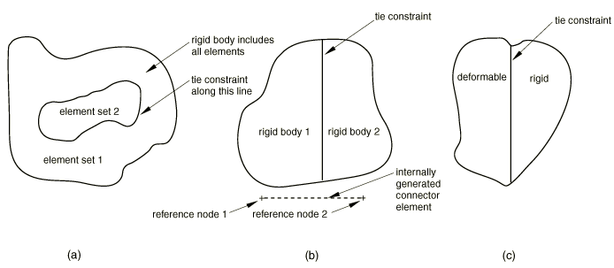 ![]() In both cases there is at least one node that, if not properly treated, will be redundantly constrained. In the case on the left, the three edges belonging to the three surfaces overlap (shown here in an exploded view for clarity). Each of the three end nodes on either end occupy the same location. Therefore, one redundant tie constraint exists. In the case shown on the right, four adjacent meshes are “glued” together using four tie constraints. Only three constraints are needed to “glue” the center nodes together, but four are generated (one from each tie constraint). Therefore, one constraint is not needed and in both cases one constraint is removed. Tie constraint inside a rigid body constraintAn example of a tie constraint inside a rigid body constraint is shown in Figure 3(a). Two surfaces are connected by a tie constraint, and the two element sets are included in the same rigid body. Since the motion of all the nodes is constrained to the motion of the rigid body's reference node, the tie constraint is redundant. The tie constraint definition is removed from the model. Figure 3. Consistent overconstraints due to combinations of tie and rigid body