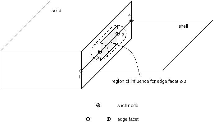 • uses a set of internally defined distributing coupling constraints to couple the motion of a “line” of nodes along the edge of a shell model to the motion of a set of nodes on a solid surface;