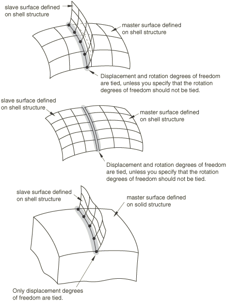 ProductsAbaqus/StandardAbaqus/ExplicitAbaqus/CAE Defining a tie constraint for a pair of surfacesA surface-based tie constraint can be used to make the translational and rotational motion as well as all other active degrees of freedom equal for a pair of surfaces. By default, as discussed below, nodes are tied only where the surfaces are close to one another. One surface in the constraint is designated to be the slave surface; the other surface is the master surface. A name must be assigned to this constraint and may be used in postprocessing with Abaqus/CAE. Input File Usage TIE, NAME=name slave_surface_name, master_surface_name Abaqus/CAE Usage Interaction module: Create Constraint: Tie Defining the surfaces to be constrainedEither element-based or node-based surfaces can be used as the slave surface. Any surface type (element-based, node-based, or analytical) can be used as the master surface. You may need to take some surface restrictions into consideration depending on which tie formulation is used and whether the analysis is conducted in Abaqus/Standard or Abaqus/Explicit. Two tie formulations are available: the surface-to-surface formulation, which is used by default in Abaqus/Standard, and the more traditional node-to-surface formulation, which is used by default in Abaqus/Explicit; these formulations are discussed in more detail later in this section. Table 1 and Table 2 provide comparisons of surface restrictions for the different formulations and analysis codes.