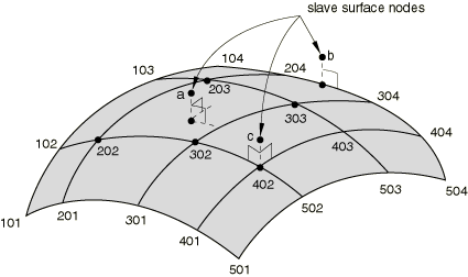 Input File Usage TIE, TYPE=SURFACE TO SURFACE Abaqus/CAE Usage Interaction module: Create Constraint: Tie: Discretization method: Surface to surface The “node-to-surface” approachThe traditional “node-to-surface” approach (which is used by default in Abaqus/Explicit and is optional in Abaqus/Standard) sets the coefficients equal to the interpolation functions at the point where the slave node projects onto the master surface. This approach is somewhat more efficient and robust for complex surfaces. For the node-to-surface method of establishing the tie coefficients with an element-based master surface, the point on the surface closest to each slave node is calculated and used to determine the master nodes that are going to form the constraint (see Figure 5). For example, nodes 202, 203, 302, and 303 are used to constrain node a; nodes 204 and 304 are used to constrain node b; and node 402 is used to constrain node c. Figure 5. Searching for the points on an element-based master surface that are