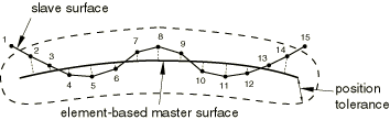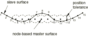![]() shows an example with no thickness: nodes 2–14 satisfy the position tolerance criterion for the node-to-surface and surface-to-surface constraint formulations. Significant portions of the end slave segments (that is, the segment connecting nodes 1 and 2 and the segment connecting nodes 14 and 15) are within the position tolerance shown, so nodes 1 and 15 would also satisfy the position tolerance criterion for the surface-to-surface constraint formulation except for the fact that the angle between the slave and master surfaces is slightly greater than 30° at those locations. Position tolerance for a node-based master surfaceThe default position tolerance for a node-based master surface is based on the average distance between nodes in the master surface. The distance between the surfaces for a particular slave node is based on the closest master node. If this distance is less than the position tolerance, Abaqus will create a tie constraint between the slave node, the closest master node, and other master nodes in similar proximity to the slave node. For mismatched meshes across a tied interface, the distance between slave and master nodes can be much larger than the “normal” distance between the surfaces, which can lead to confusion when using a position tolerance criterion with a node-based master surface. Figure 3 shows how the tolerance region is defined around a node-based master surface. The surface-to-surface constraint formulation reverts to the node-to-surface constraint formulation for a node-based master surface. Figure 3. Tolerance region around a node-based master surface with no